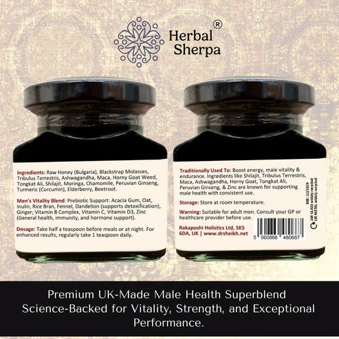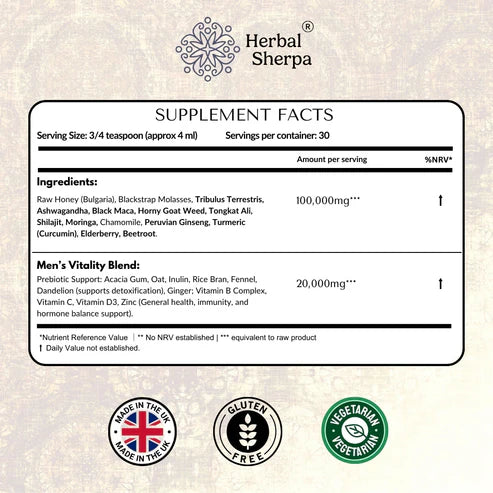 Raw Honey (Bulgaria), Blackstrap Molasses, Tribulus Terrestris, Ashwagandha, Maca, Horny Goat Weed, Tongkat Ali, Shilajit, Moringa, Chamomile, Peruvian Ginseng, Turmeric (Curcumin), Elderberry, Beetroot.