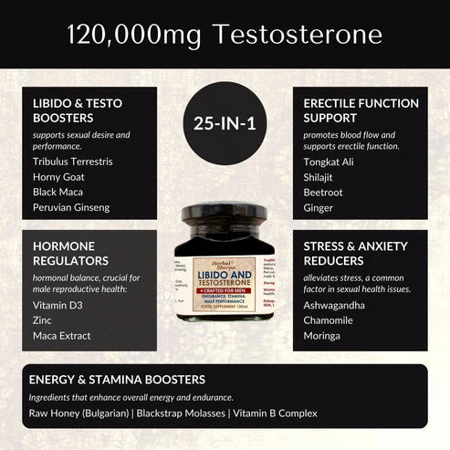 ✔ 25-in-1 Vitality Blend – A 120,000mg formula with Tribulus, Maca, Horny Goat, Tongkat Ali & Zinc for natural testosterone support.